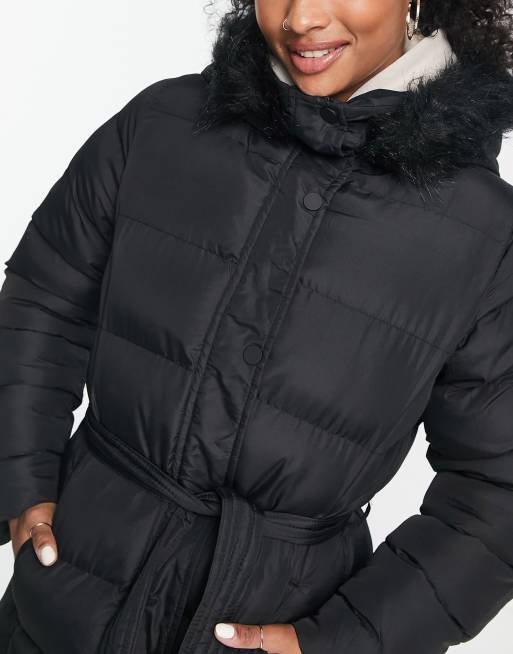 Product Name: Black belted puffer jacket with fur hood best sale
